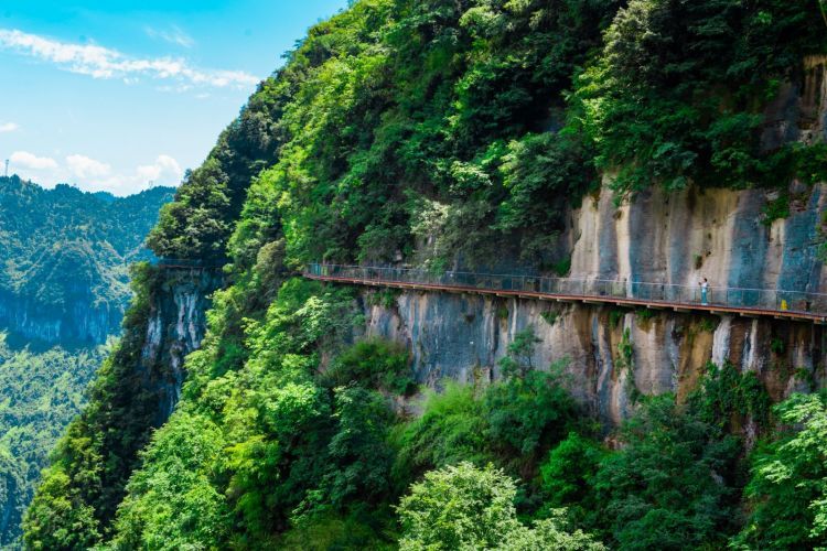 张家界大峡谷集山、水、洞、湖于一身,被誉为“张家界地貌的博物馆”!峡谷内栈道绵延数里,沿途飞瀑神泉比比皆是,宛如世外桃源。漫步【世界高、跨度长的玻璃桥——云天渡玻璃桥】,张家界大峡谷玻璃桥为世界首座斜拉式高山峡谷玻璃桥,并创下世界高长玻璃桥、使用新型复合材料建造桥梁等多项世界之,桥面长375米,宽6米,走在300米高空的玻璃桥上,仰望蓝天白云,俯瞰溪流潺潺,感受云端刺激,挑战自我!